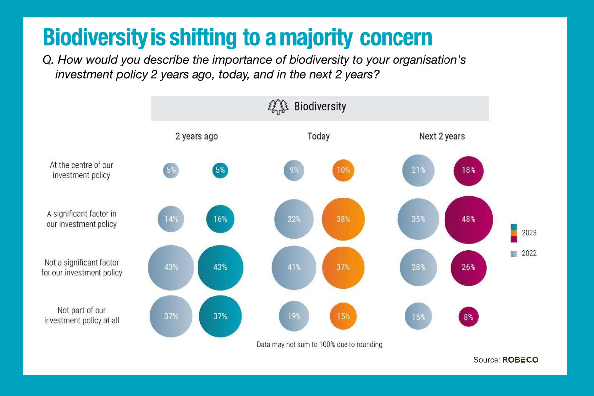 Robeco’s 2023 Global Climate Survey found that only one quarter of investors currently use funds specifically targeting biodiversity goals, but there has been a big jump in demand for impact funds, 60%, and thematic funds, 57%, since last year’s survey.