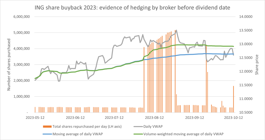 According to Seigne, there is indirect evidence for hedging in the €1.5 billion ING buyback transaction. Regulatory disclosures suggest that the broker didn’t transfer the majority of the shares to ING until after the company paid a dividend in August 2023. Seigne believes that the broker did this because it prior to that date it was holding the shares as a hedge, enabling it to receive the dividend, which outweighed the €66 million contractual loss on its buyback contract.